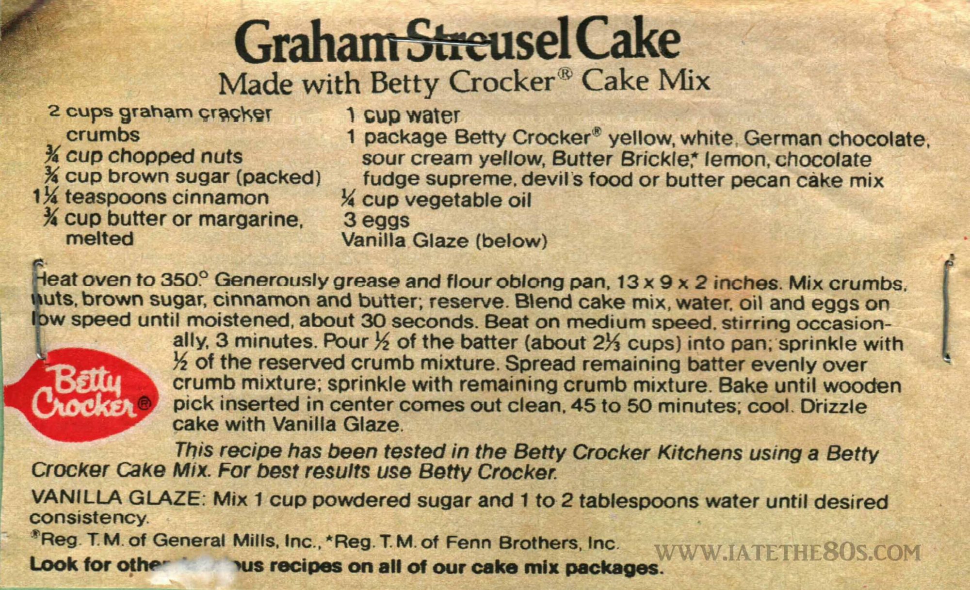 Heat oven to 350 degrees. Generously grease and flour 9 x 13 pan. Mix crumbs, nuts brown sugar, cinnamon, and butter; reserve. Blend cake mix, water, oil and eggs on low speed until moistened, about 30 seconds. Beat on medium speed, stirring, occasionally, 3 minutes. Pour ½ batter (about 2 1/3 cups) into pan; sprinkle with ½ of the reserved crumb mixture. Spread remaining batter evenly over crumb mixture; sprinkle with remaining crumb mixture. Bake until wooden pick inserted in center comes out clean, 45 to 50 minutes; cool. Drizzle cake with Vanilla Glaze.